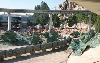 Stretching a quarter-mile, and including an “underwater cave,” the lagoon holds 6,300,000 gallons of water. When drained, the lagoon is essentially a large horseshoe-shaped concrete pool with walls that are approximately 80 feet wide and 20 feet tall. In addition to decorative ride elements, the pool contains nine “dry boxes” – rooms that hold the ride’s electronics, keeping them dry under the water.