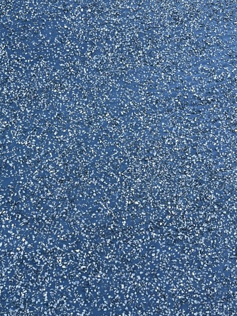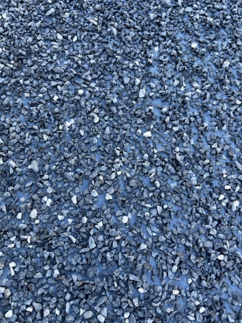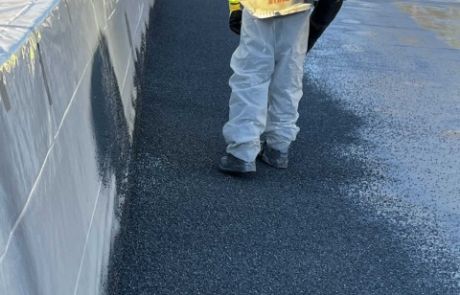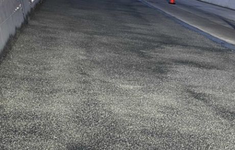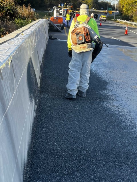 While still tacky, gravels were broadcast onto the surface to promote better mechanical bonding of the asphalt pavement layer applied later on top of the polyurea system.
